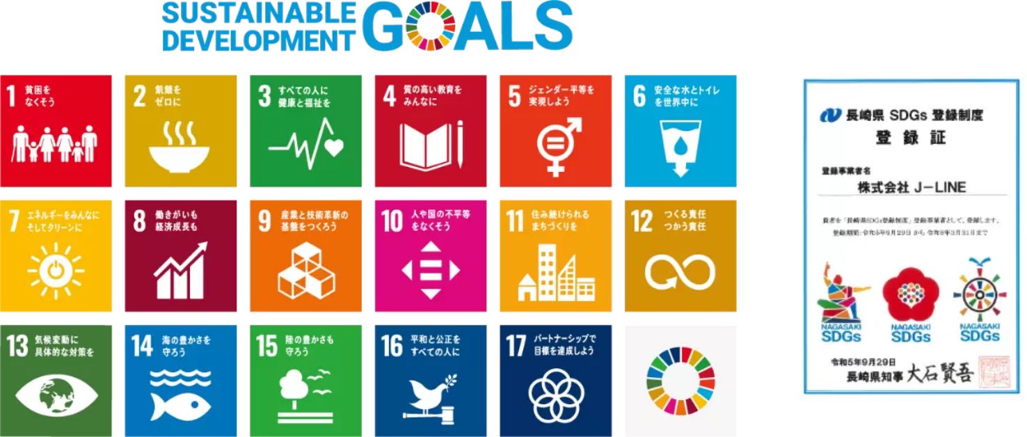 株式会社J-LINEは、主に建設業界において環境や安全を配慮した製品の研究・開発を行い、全国各地に普及させることで労働者が働きやすい環境づくりの一端を担うことを目指しており、事業活動を通して地域社会、そしてSDGsの達成に貢献していきます。