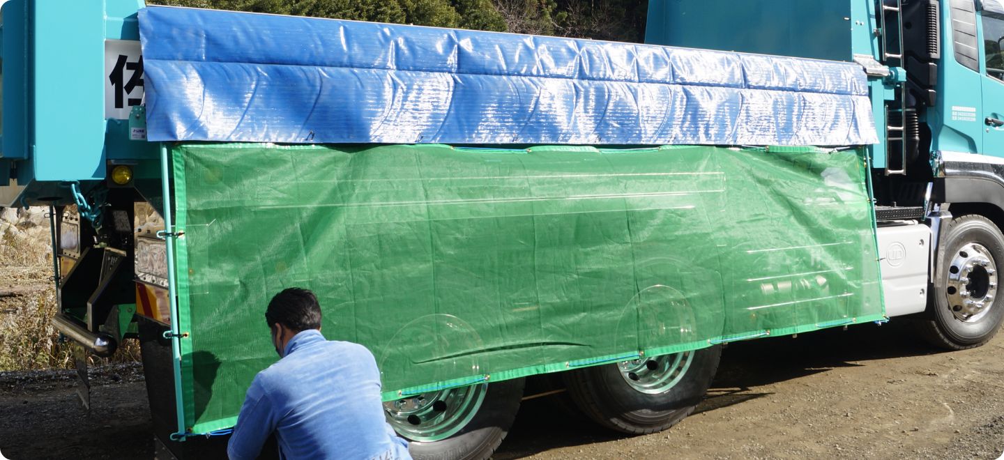 『メッシュタイプ』・『防水タイプ』・『特注防水タイプ』の3種類がございます。メッシュタイプ/防水タイプのシートサイズは4300×1150サイズとなり、こちらは即納品(防水は在庫次第)が可能です。特注防水はダンプ後部まで覆うタイプで、主に汚染土運搬等で利用されております。こちらは特注になりますので納期と金額に関しては別途ご相談になります。通常(4300×1150)よりサイズが長くなる場合においても同様です。詳しくはお問い合わせください。