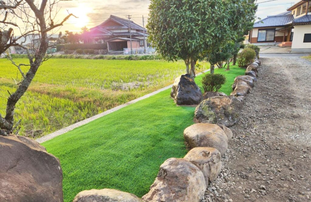 庭やアプローチまわりの景観を整えながら、日々の手入れの負担を軽減したいというご要望から、人工芝による外構整備をご提案しました。既存の植栽や自然石を活かしながら、見た目の美しさと管理のしやすさを両立しています。