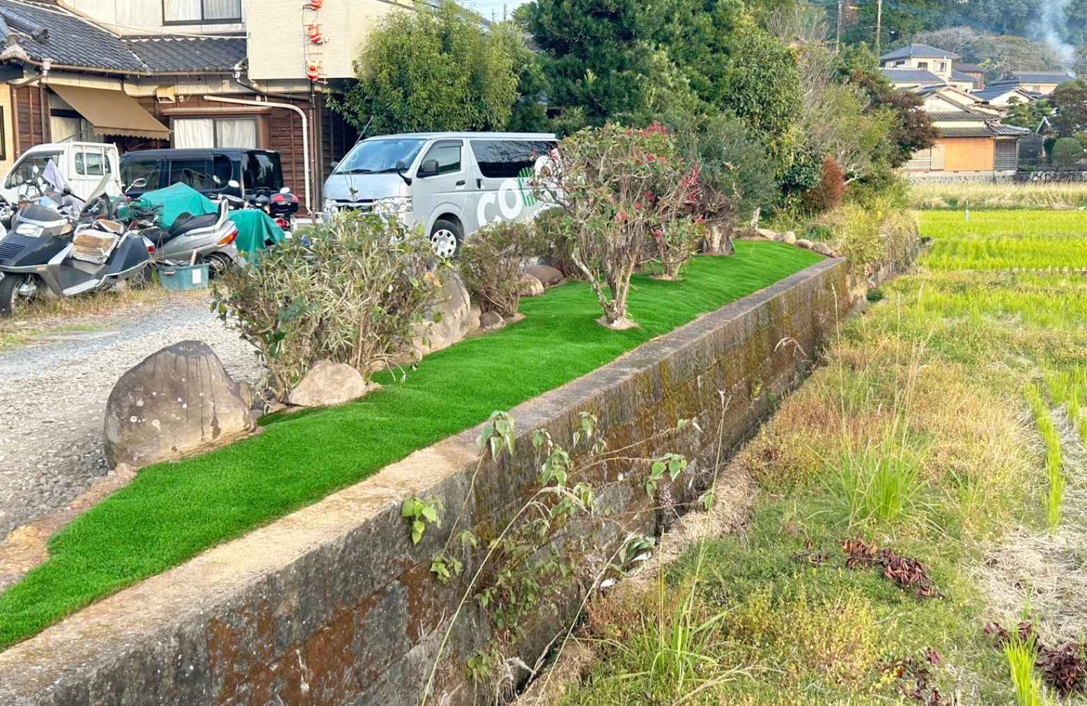 - 植栽や自然石まわりに沿った丁寧なカット